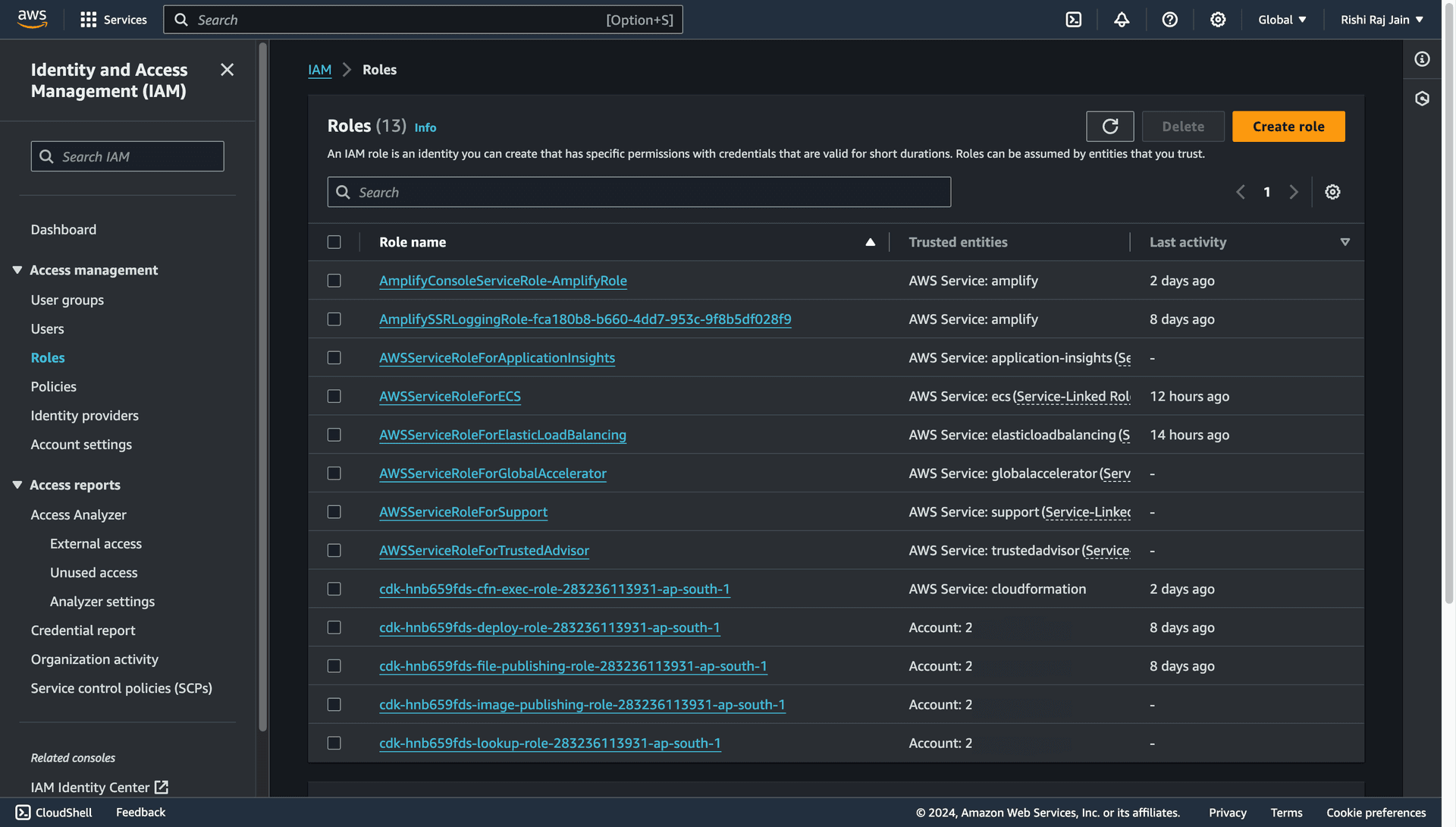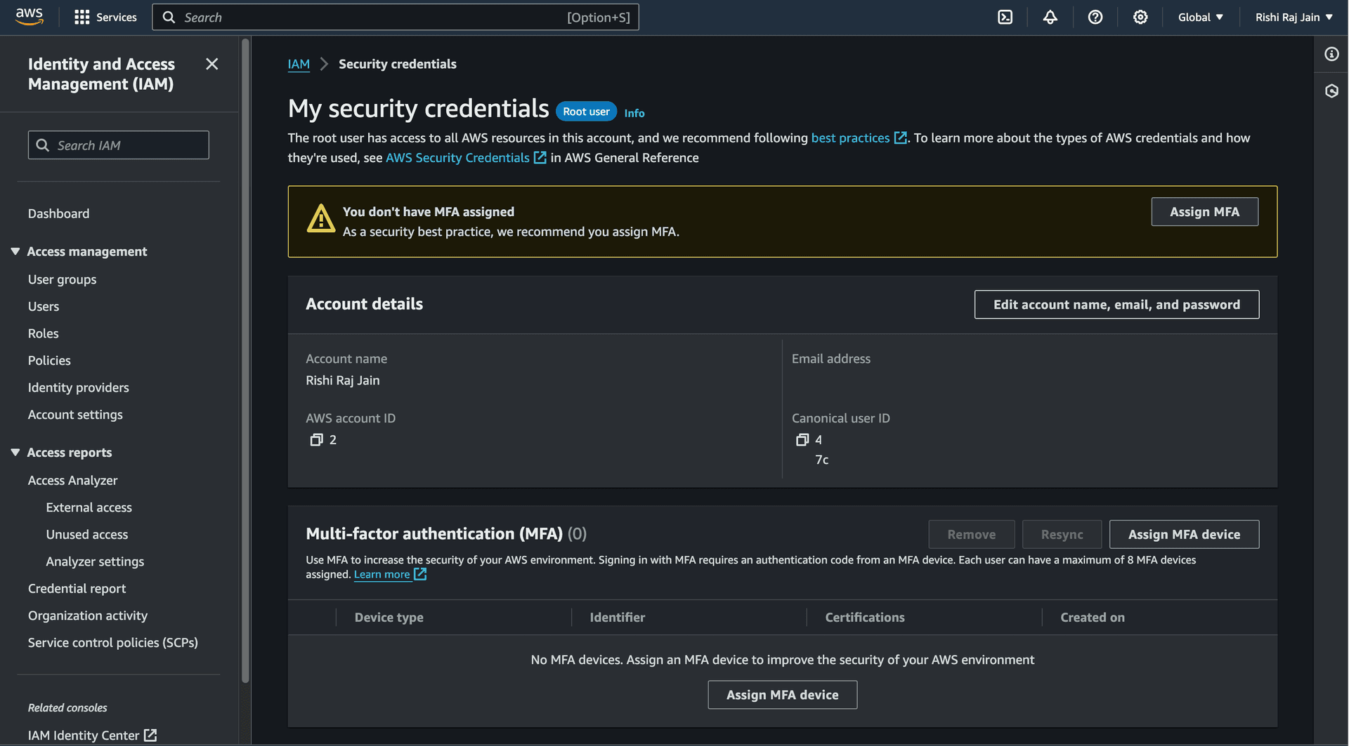 - In the navigation bar in your AWS account, choose your user name, and then choose Security credentials.