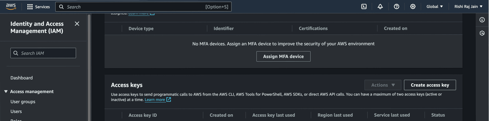 - Scroll down to Access keys and click on Create access key.