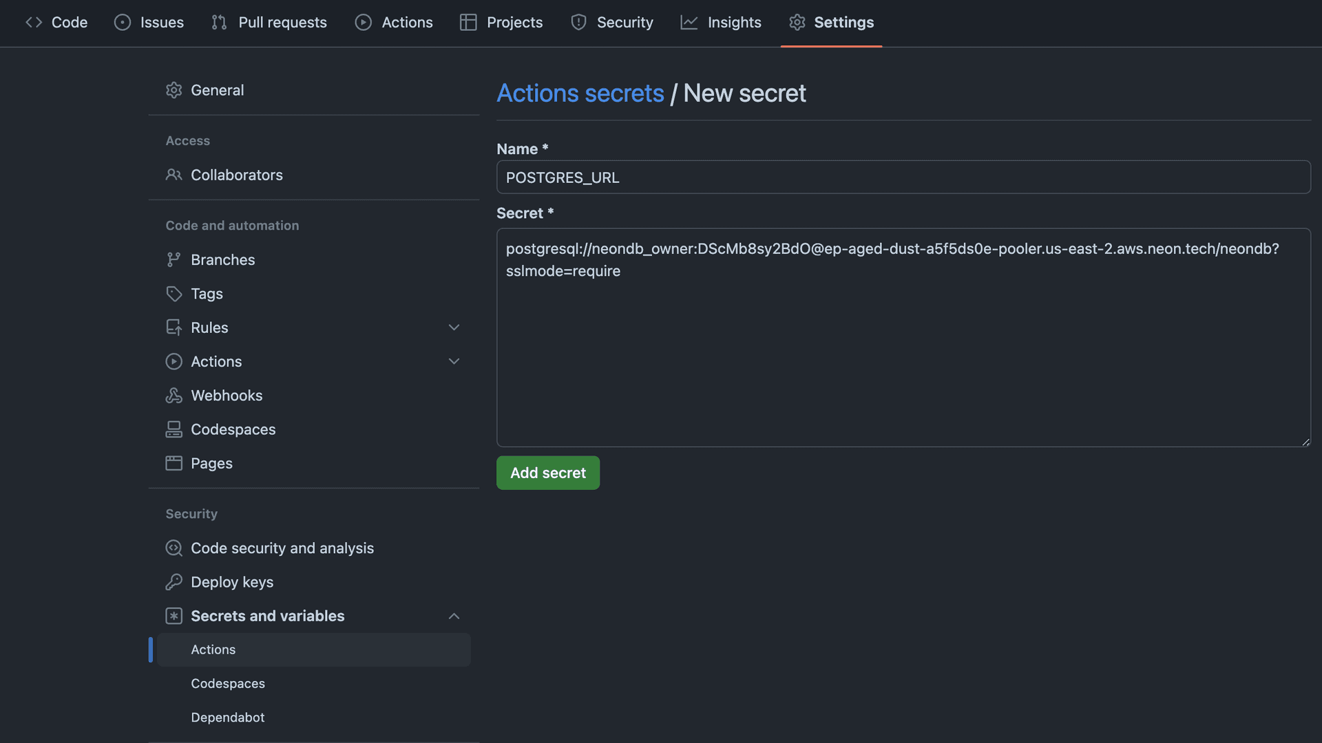 - Enter POSTGRES_URL as the value obtained earlier.