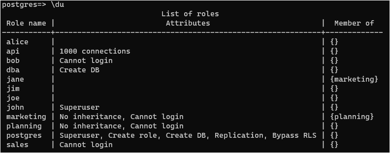 postgres=#Second, use the \du to list all user accounts (or roles) in the current PostgreSQL database server: