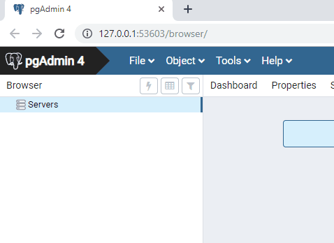 The pgAdmin application will launch on the web browser as shown in the following picture: