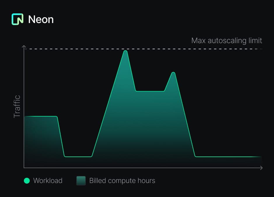 • Neon autoscales according to traffic, dynamically adjusting CPU and memory as needed.